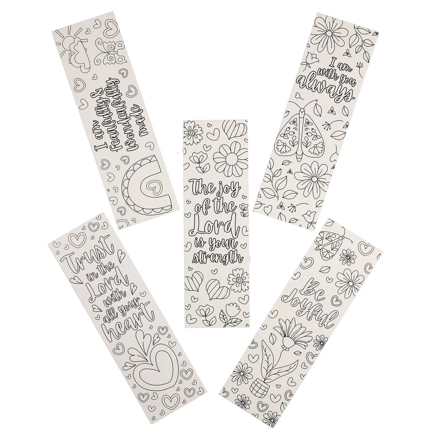 Be Joyful Five-Piece Coloring Bookmark Set® offers inspiring and faith-filled designs perfect for quiet reflection or creative devotion time. Each bookmark features uplifting Bible verses paired with beautiful imagery, providing spiritual encouragement during your reading or study. Made from 350 gsm white artcard, these double-sided bookmarks are uncoated for easy coloring and come packaged in a self-seal bag with a hanging tab. Ideal for gifting, Bible study groups, or personal use, this set combines creativity with moments of spiritual growth and joy.