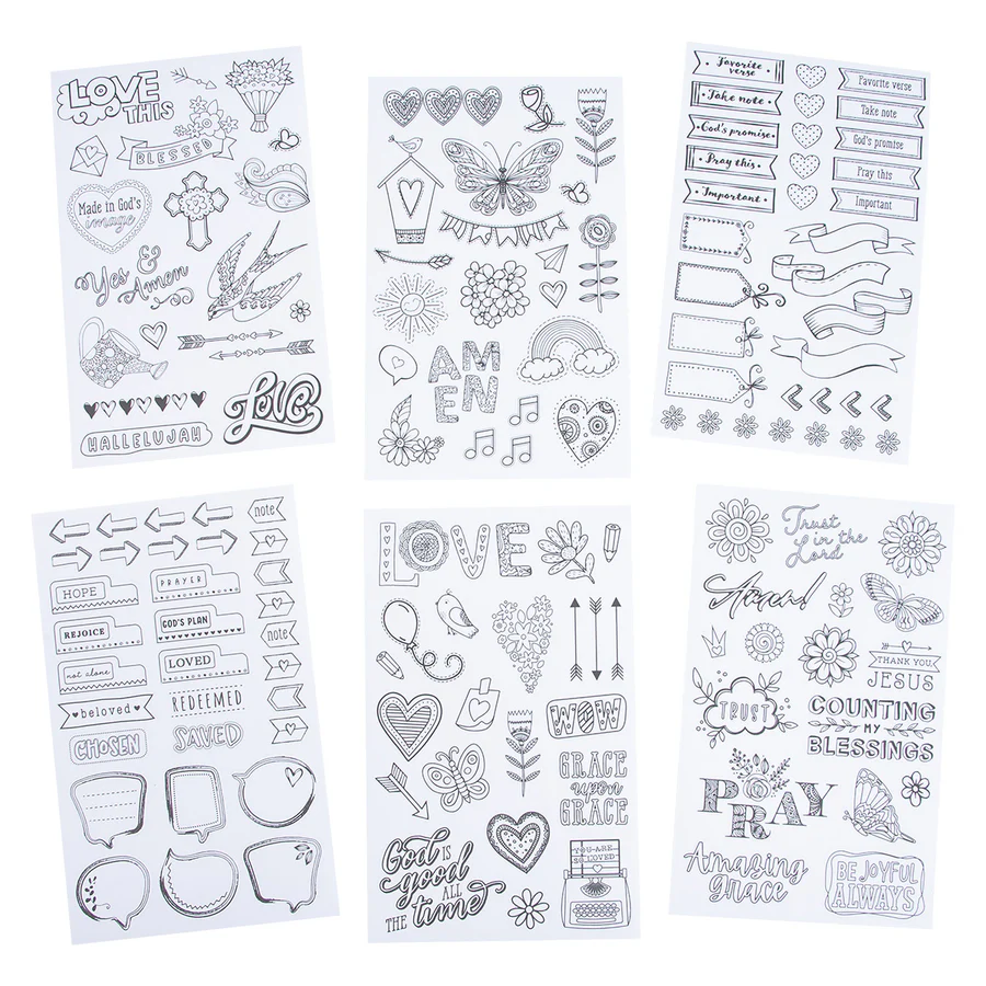 Add faith-filled flair to your Bible journaling with Coloring Stickers For Bible Journaling Set Of 6 Sticker Sheets. 120+ customizable vinyl stickers (verses, crosses, florals) for coloring—repositionable, durable for journals, planners, crafts.