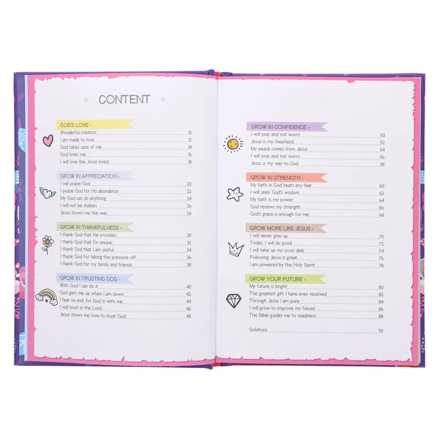 The Creative Bible Journal offers tweens aged 8-12 a unique way to grow in faith through 40 different devotions that invite them to read, think, draw, and solve puzzles. Each devotion spans two pages: the first presents a Bible verse with a reflective text and coloring space, while the second encourages solving a puzzle and writing thoughts or guided prayers to connect the scripture with real-life applications. Divided into 8 parts, each containing 5 devotions, this journal helps children deepen their knowledge, appreciation, and trust in God, and motivates them to follow Jesus and build a positive future. With its combination of creativity and spiritual growth, this hardcover journal is both an engaging Bible study tool and a meaningful devotional experience.
