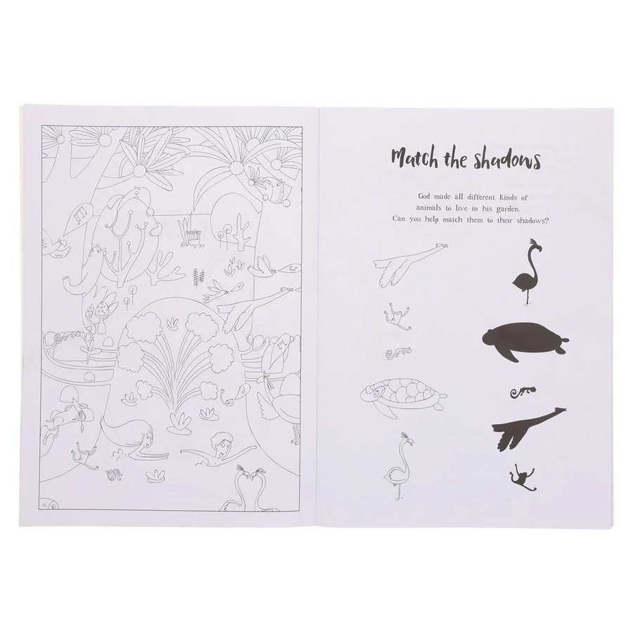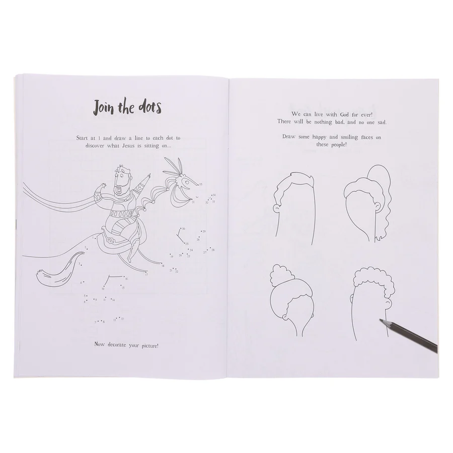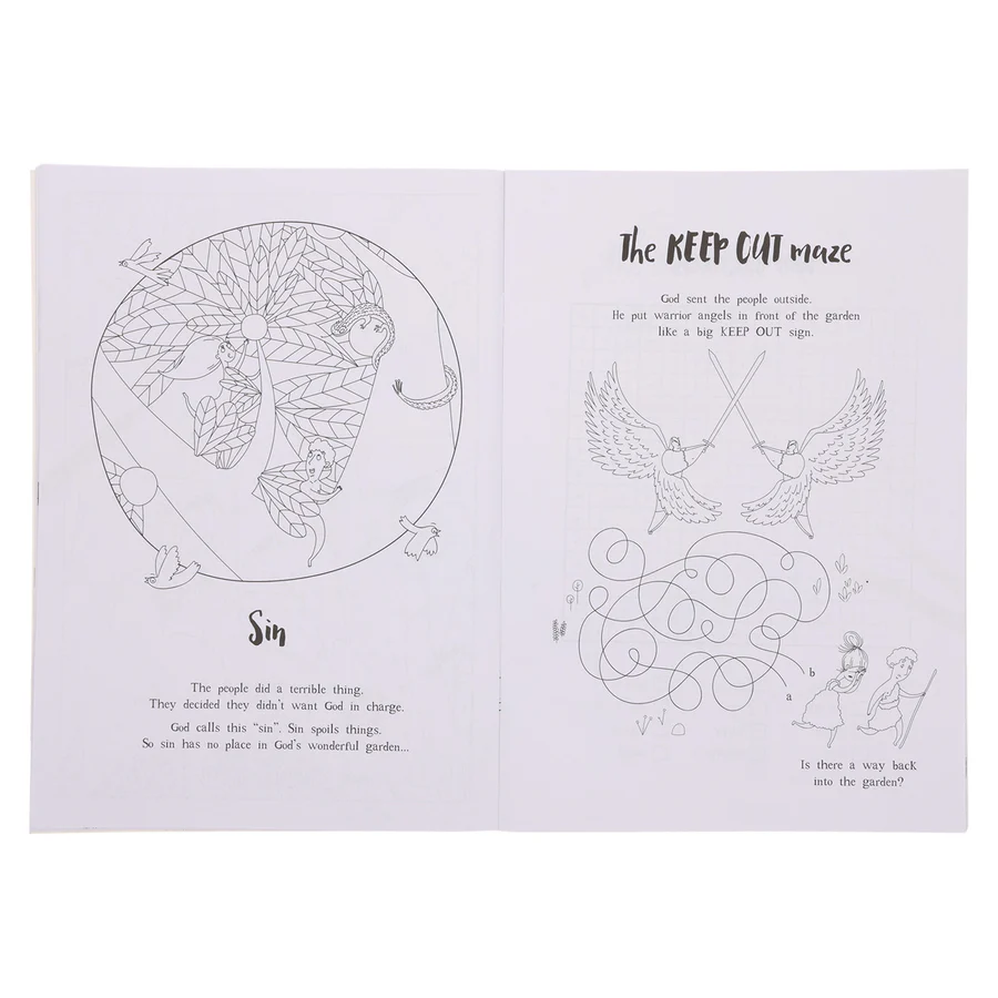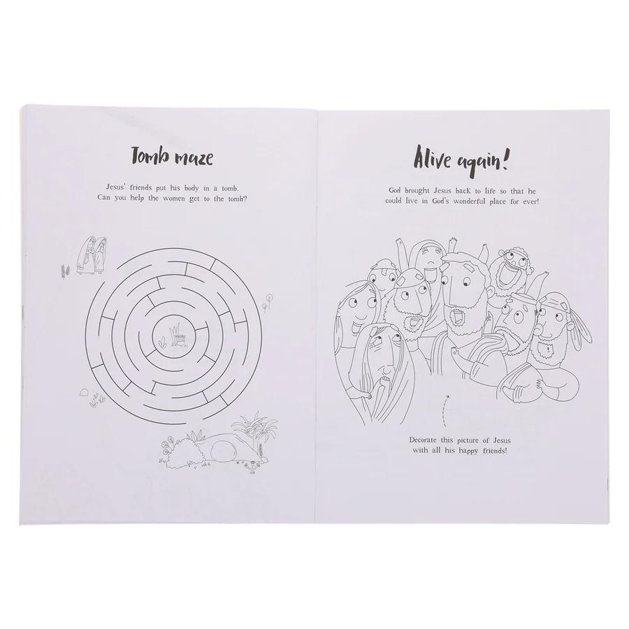 Interactive coloring and activity book teaching Jesus’ gospel story. Fun puzzles and mazes for children aged 4 to 8.